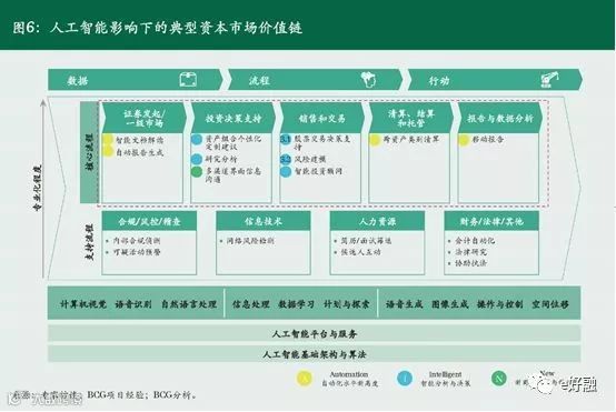 如图6所示,在资本市场五大核心流程中,人工智能推动多渠道信息整合,在资产配置建议、交易决策支持、风险建模、智能投顾等方面强化智能分析能力,并在文档解读、报告生成、跨资产清算等环节实现高度自动化[k]。
