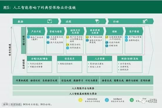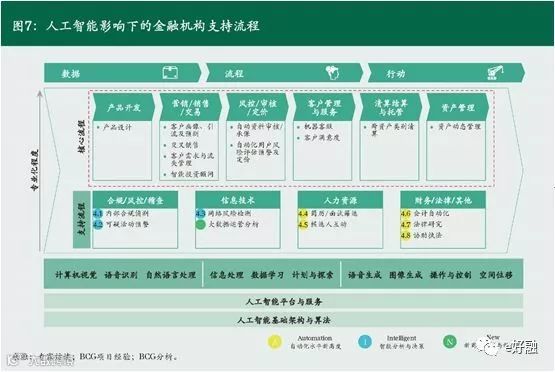 如图7所示,人工智能在四大支持流程中推动大数据运营分析,在内部合规、可疑行为预警、网络安全等方面提升智能决策能力,并在简历筛选、会计自动化、法律研究等领域实现自动化跃升[k]。