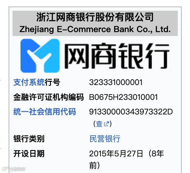 浙江网商银行股份有限公司(简称:网商银行,英文:Zhejiang E-Commerce Bank Co., Ltd.,缩写:MYBank)是中国大陆第五家获准开业的民营银行,亦为首批试点的五家民营银行之一[k]。