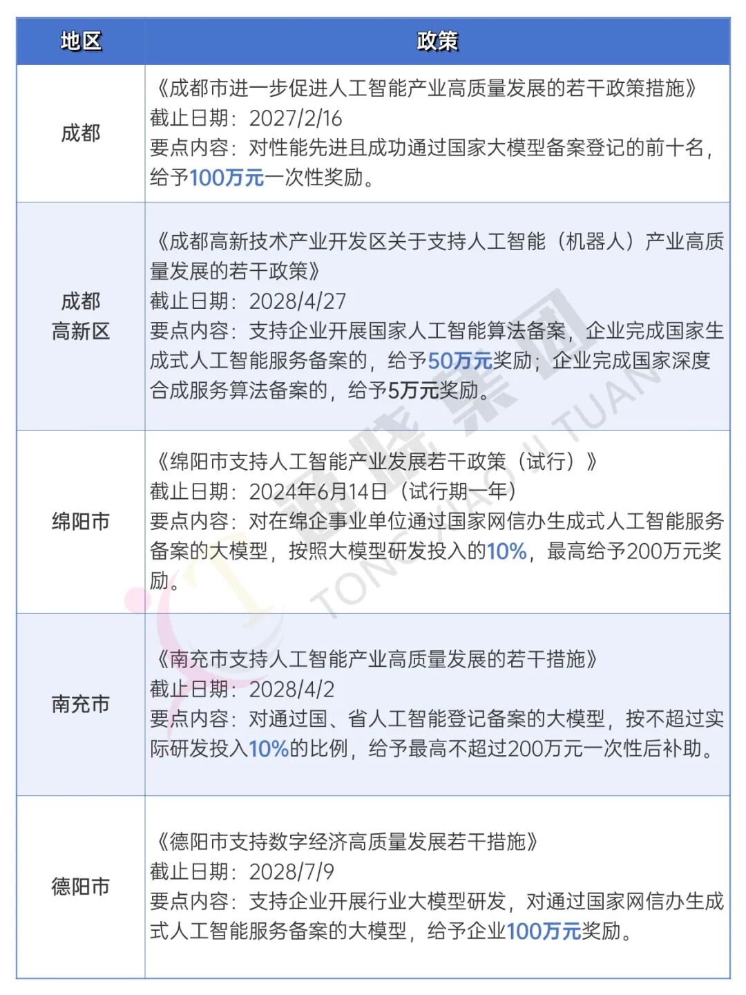 ➢ 四川省和成都市政府先后出台了多项规划和政策,其中四地有针对履行大模型备案手续的直接奖励政策: