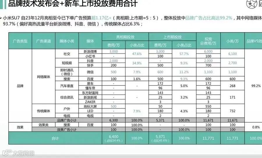 你们说雷总擅长营销,没错,它精准的把小米SU7的投放给了微博、抖音和快手,占了近90%,这都是高热流量平台。但是,在这些平台我们接受的绝大多数都是碎片化内容,都是没有深度的热点新闻或者所谓的段子,它能让我们忽视一款产品的好坏冲动消费。我想,这也是网传小米SU7退单率不低(约40%)的原因吧。待到潮水退去,谁在裸泳一看便知。