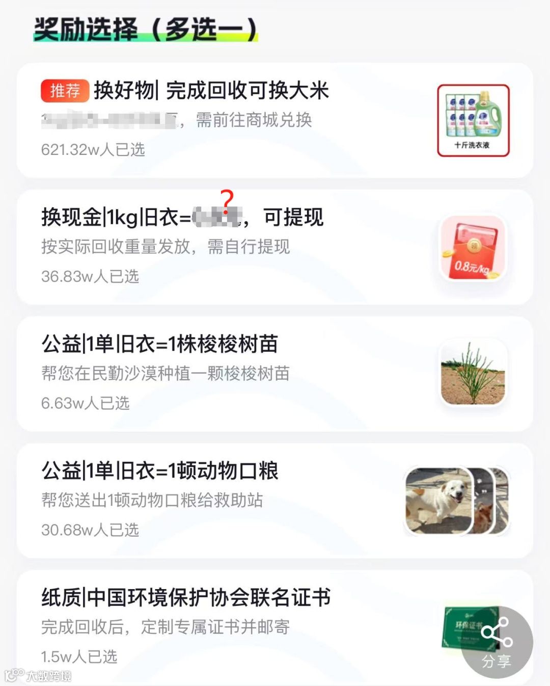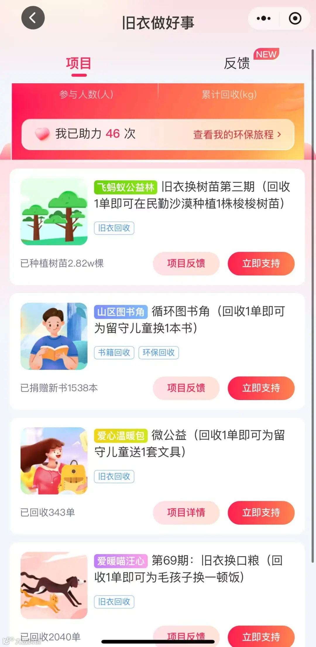更暖心的是,除了回收换钱,您也可以选择回收旧衣服做公益,飞蚂蚁有【爱暖喵汪心-为流浪猫狗送口粮】、以及【用一份爱,造一片林】公益活动正在进行中,让你的旧衣,既能换钱,又能参与活动!