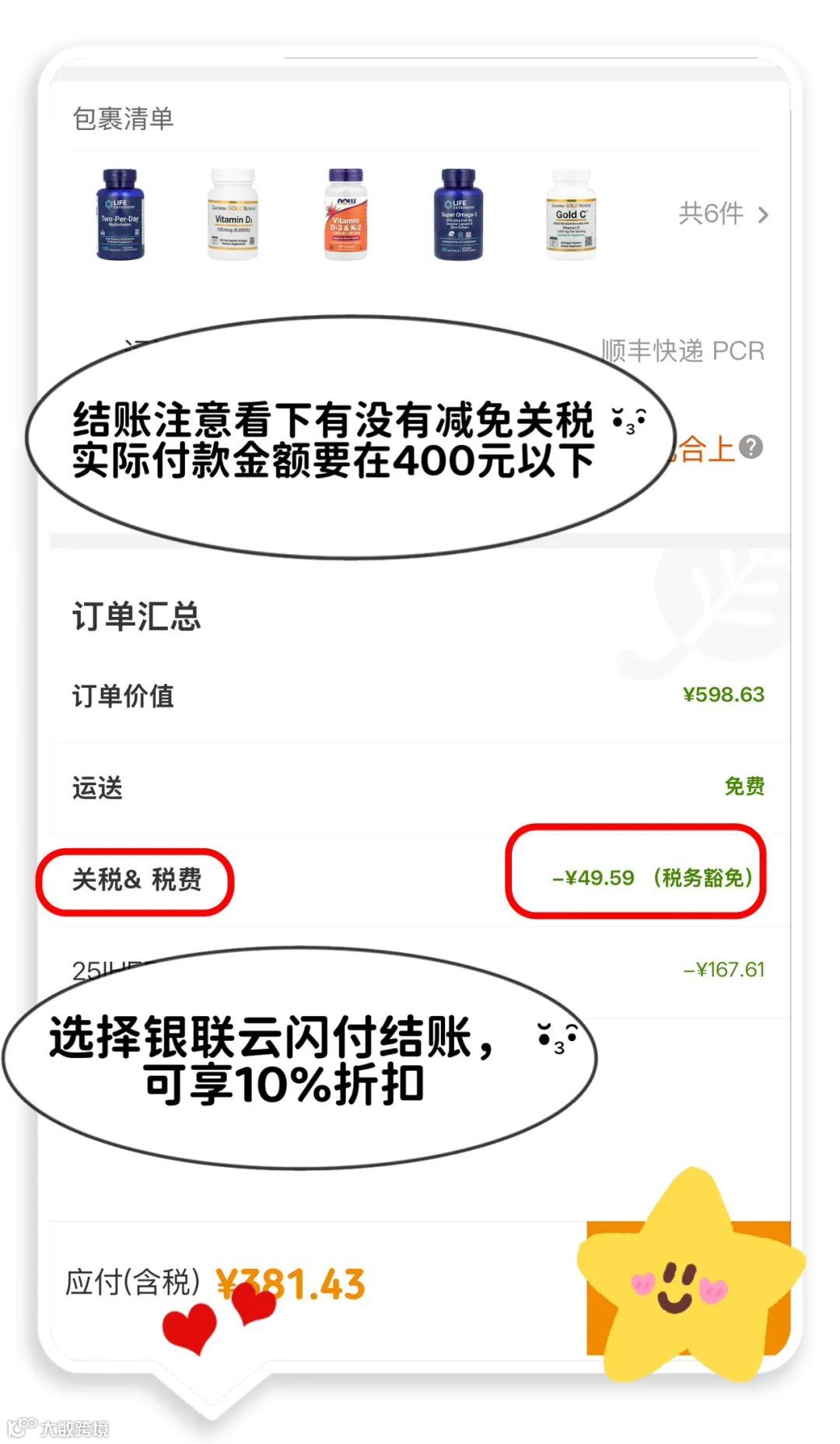 建议将订单实际付款金额控制在400元以下,实现包邮免税。具体如下图所示: