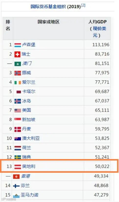 奥地利属于世界上十大最富裕国家,大致在第七名位置。