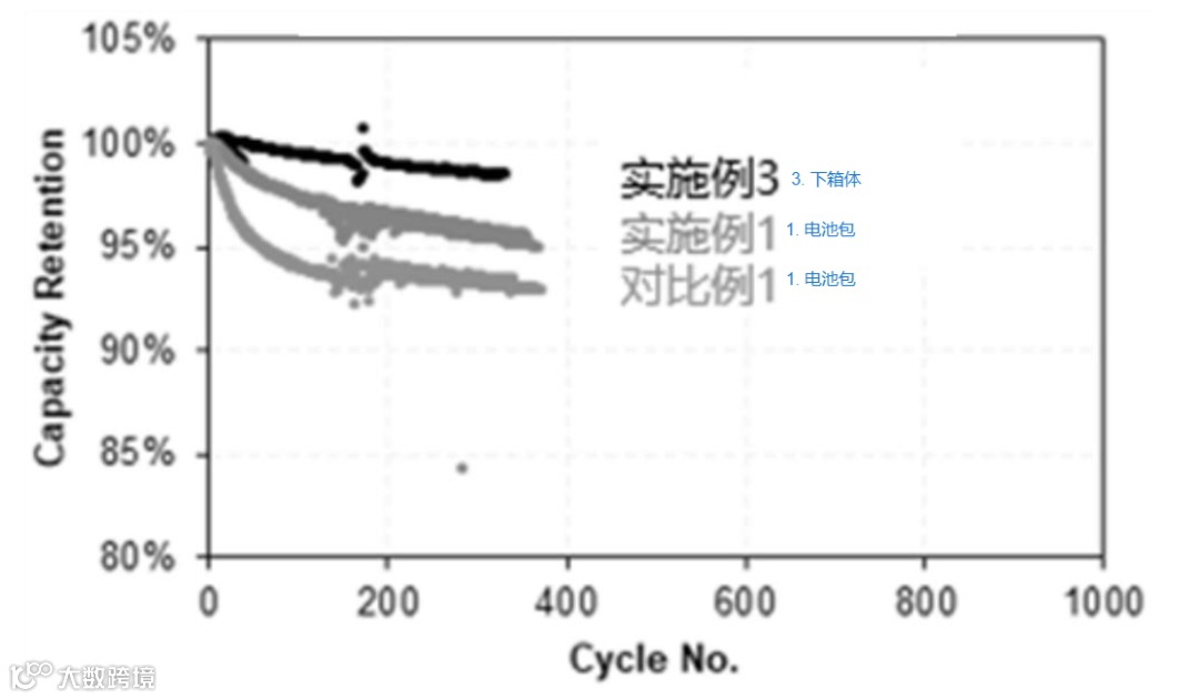 性能对比:下图为实施例 1、实施例 3 与对比例 1 的容量保持率随循环次数变化曲线(横坐标为循环次数 Cycle No.,纵坐标为容量保持率 Capacity Retention)。