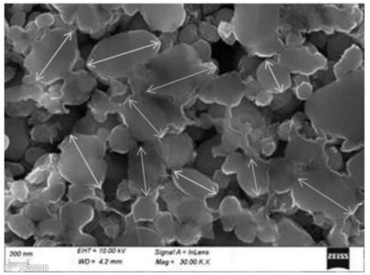 关键颗粒表征:下图为磷酸铁锂盐颗粒的扫描电镜图,双箭头标注的 “一次粒径” 是颗粒切面边缘最长距离,通过控制该参数解决产气问题。