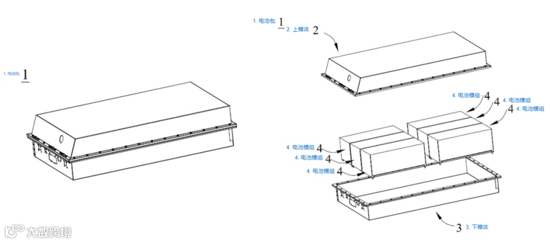 结构形态:包括电池箱与多个电池模组 4,电池箱由上箱体 2 与下箱体 3 组成,上箱体 2 可盖合于下箱体 3,形成封闭的容纳空间,多个电池模组 4 按需求排布于该空间内。电池包作为更高层级的储能单元,为用电装置提供稳定的能量供应,同时具备一定的机械防护能力。