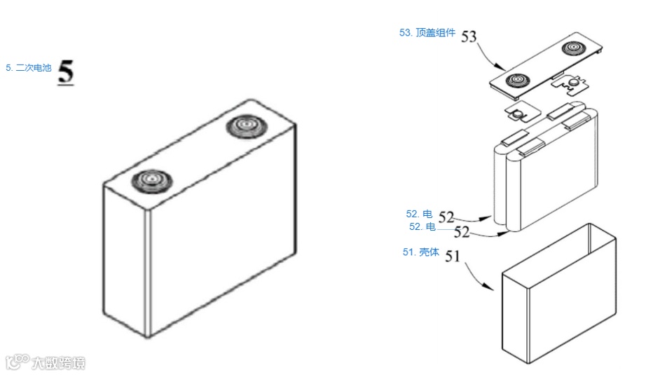 外包装包括壳体 51 与顶盖组件 53,壳体 51 由底板与侧板围合形成容纳腔,顶盖组件 53 盖合于壳体开口处,内部封装经卷绕或叠片工艺制成的电极组件 52,电解液浸润电极组件以实现离子传导。