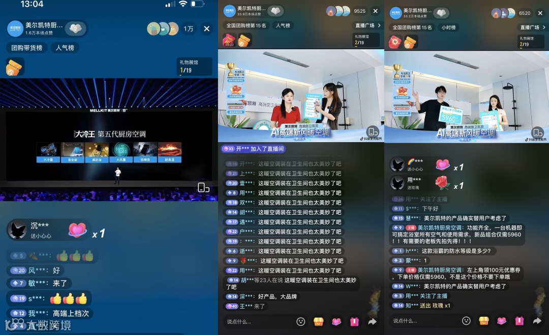 在今年国庆期间,美尔凯特厨房专用空调以「第五代厨房空调」发布为核心动作,将“新品发布会”搬上抖音生活服务,通过达人探厂、导购直播、短视频预热等多种形式打造声量。同时,全国 500 多家门店同步参与,实现线上传播与线下体验联动。