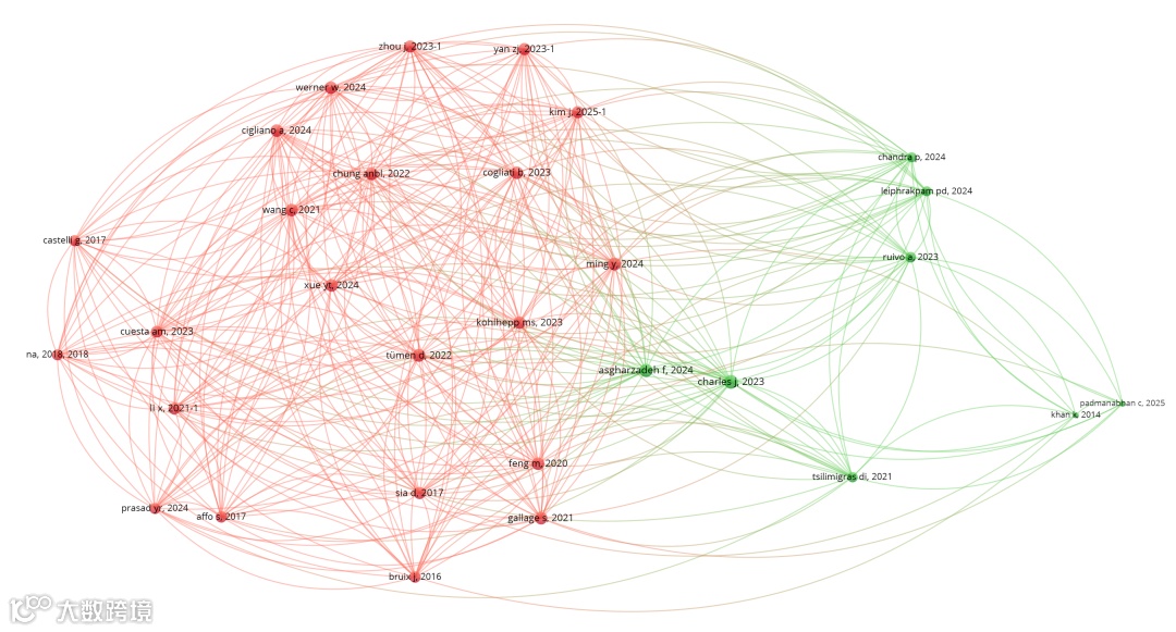 节点:每个节点代表一篇文献(格式为 作者,年份,如 bruix j, 2016)。连接越密集的节点,说明该文献与其他文献的关联(共被引或引用)越频繁,是领域内核心文献(对知识聚合或传播起关键作用);