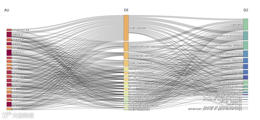 连线宽度:体现关联强度(连线越宽,说明两个维度间的 “流量” 越大,如某作者在某主题上的研究多,或某主题的论文多发在某期刊上)。
