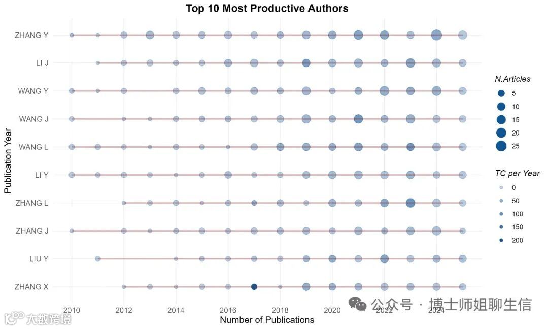 这张图是 “作者生产力 + 影响力” 的可视化画像,可快速识别 “长期高产且高影响力” 的领域核心学者(如 ZHANG Y,深蓝色 + 深灰色点多);可分析作者 “产出节奏”(持续型 vs 爆发型);可为科研合作、领域跟踪(如关注核心作者的研究方向)提供依据。