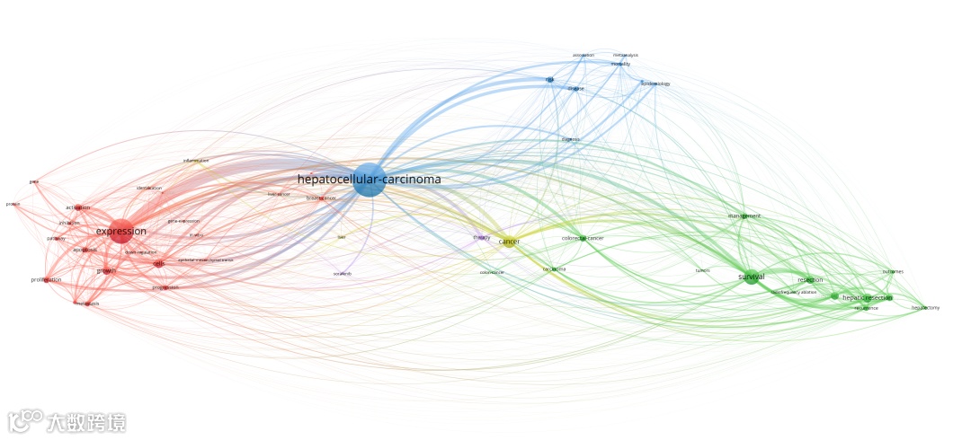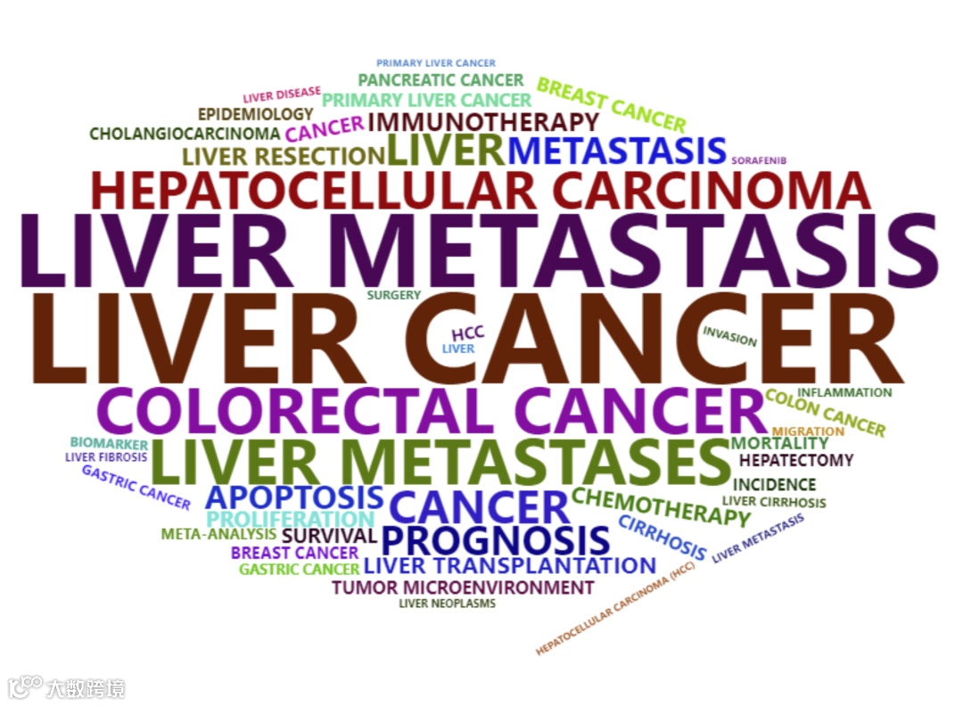 中间(DE):代表研究主题 / 关键词(如 liver cancer(肝癌)、hepatocellular carcinoma(肝细胞癌)、colorectal cancer(结直肠癌)等);
