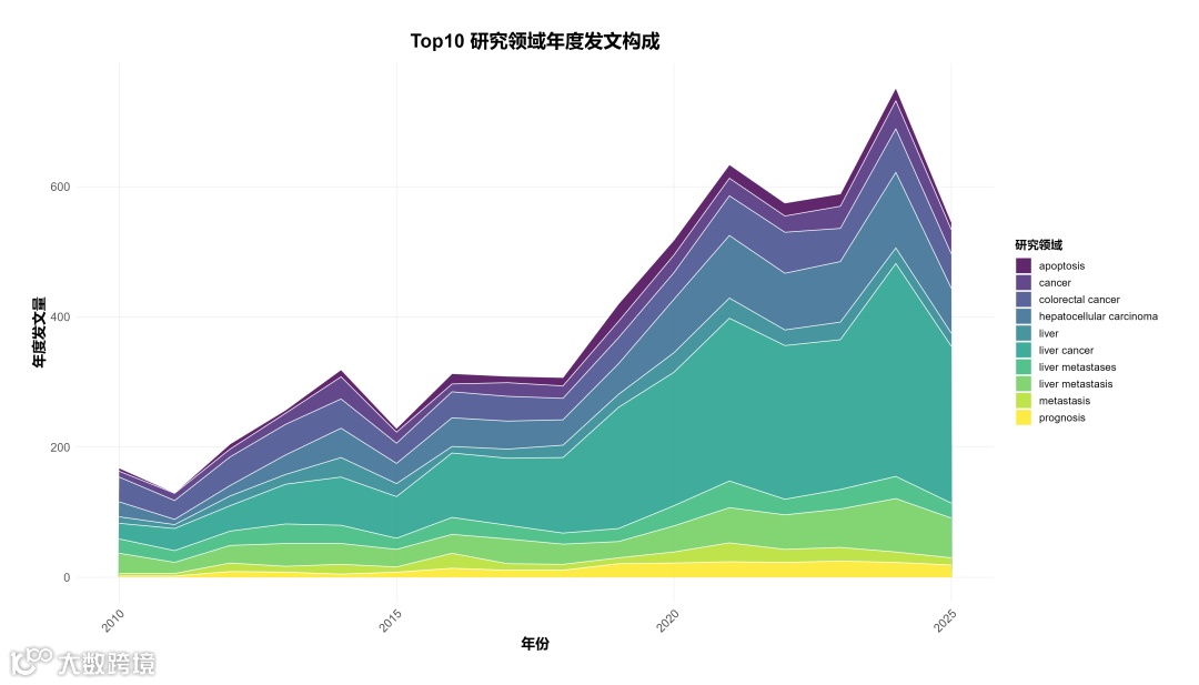 apoptosis(细胞凋亡)、cancer(癌症)、liver(肝脏)、liver cancer(肝癌)等 Top10 细分领域);堆积逻辑:每个年份的 “总面积” 对应该年 Top10 领域的总发文量;单个颜色的 “层厚” 对应该领域当年的发文量占比与规模。