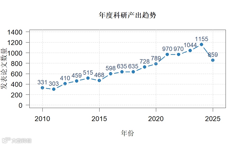 该图直观呈现特定研究领域(或基于某数据集)在 特定时间段的年度论文发表数量变化规律;