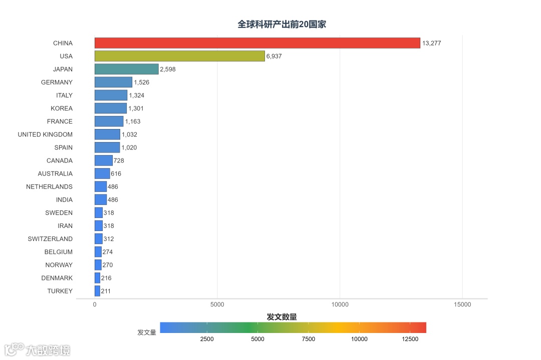 这张水平条形图的作用是直观展示全球范围内科研产出(以 “发文数量” 为指标)排名前 20 的国家,清晰呈现不同国家的科研产出规模与格局差异,为分析全球科研竞争力、领域资源分布、国际合作优先级等提供依据;