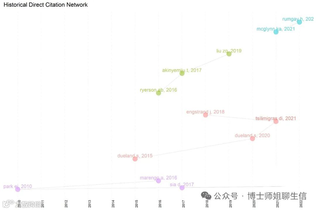 关键文献与脉络识别:早期节点(如 park ej, 2010)若持续被后续文献引用,说明是领域 “奠基性文献”;处于 “引用链中间” 的节点(如 ryerson ab, 2016),是 “中转关键文献”(连接早期与后期研究,推动思想传播); -