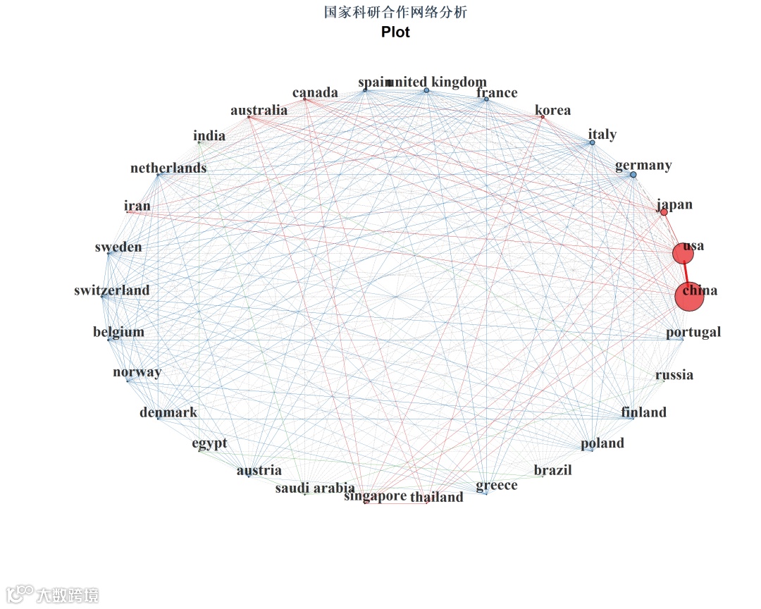 核心节点(国家):节点大小反映合作活跃度(或合作产出规模)。图中中国(China)和美国(USA)的节点明显更大,说明二者是该领域科研合作的核心国家,在国际合作中处于 “枢纽” 地位(参与的跨国合作更多、影响力更强);