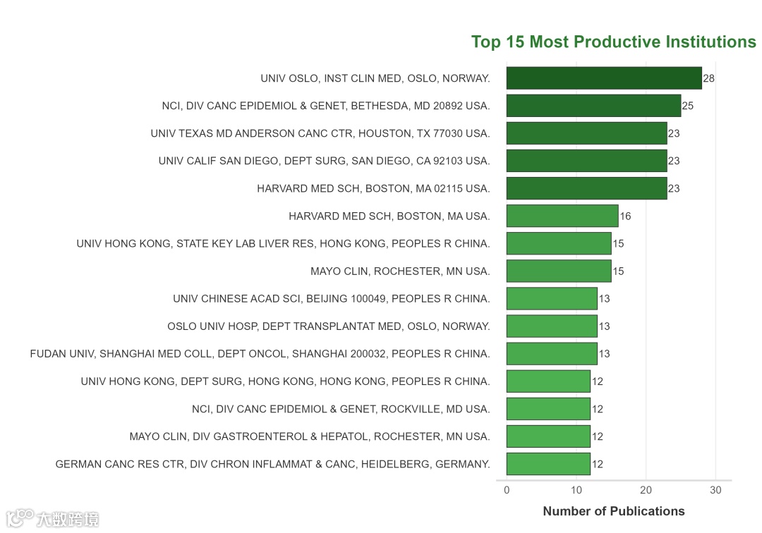 该条形图的作用是展示某研究领域中 “前 15 名最高产机构” 的发文量分布,帮助识别该领域的核心研究机构;
