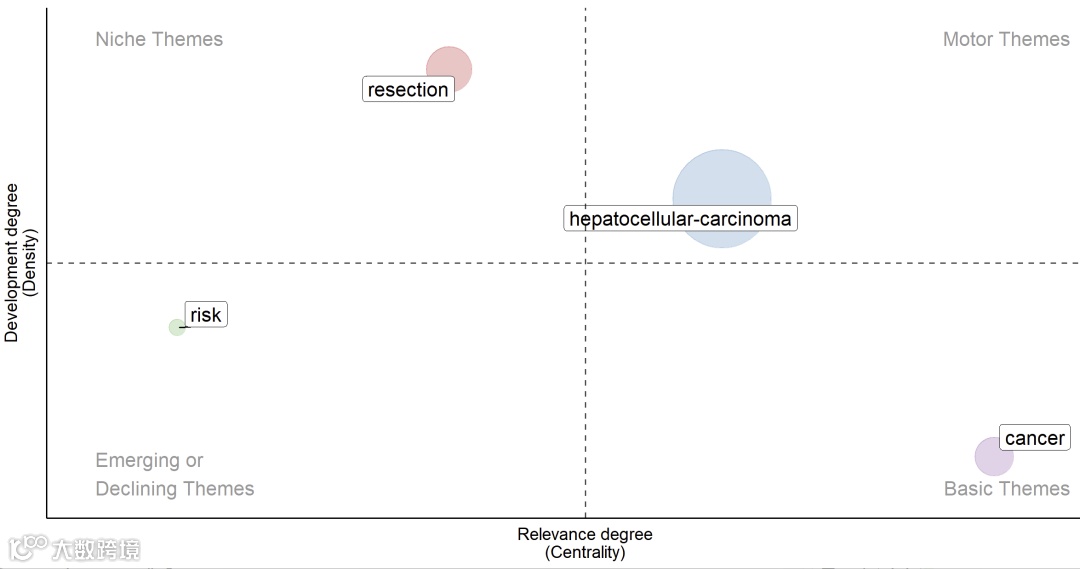 该图是研究主题的战略坐标图,用于分析某领中不同主题的 领域地位与发展潜力,辅助识别核心方向、细分热点等;