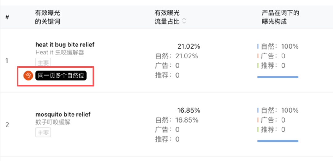 2. 关键词的下方即可快速看到获得了多个自然位的关键词列表,还有2个标签提示: