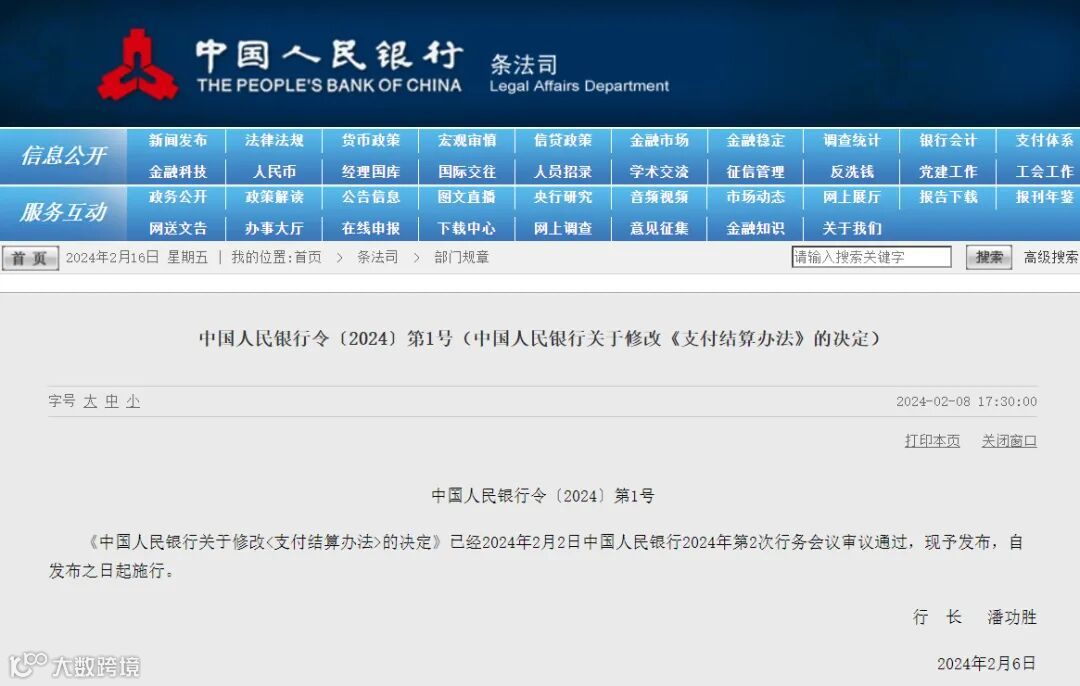 《中国人民银行关于修改〈支付结算办法〉的决定》已经2024年2月2日中国人民银行2024年第2次行务会议审议通过,现予发布,自发布之日起施行。