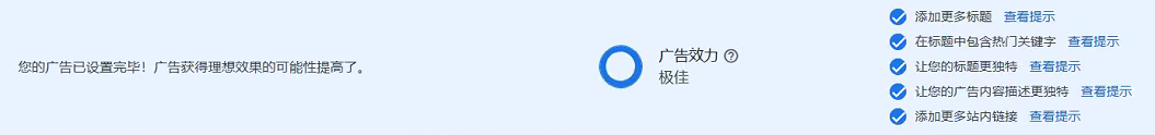 素材硬性要求:每个 RSA 建议提供 15 个高质量标题和 4 条描述,并确保广告效力达到“极佳”或者至少为“良好”。