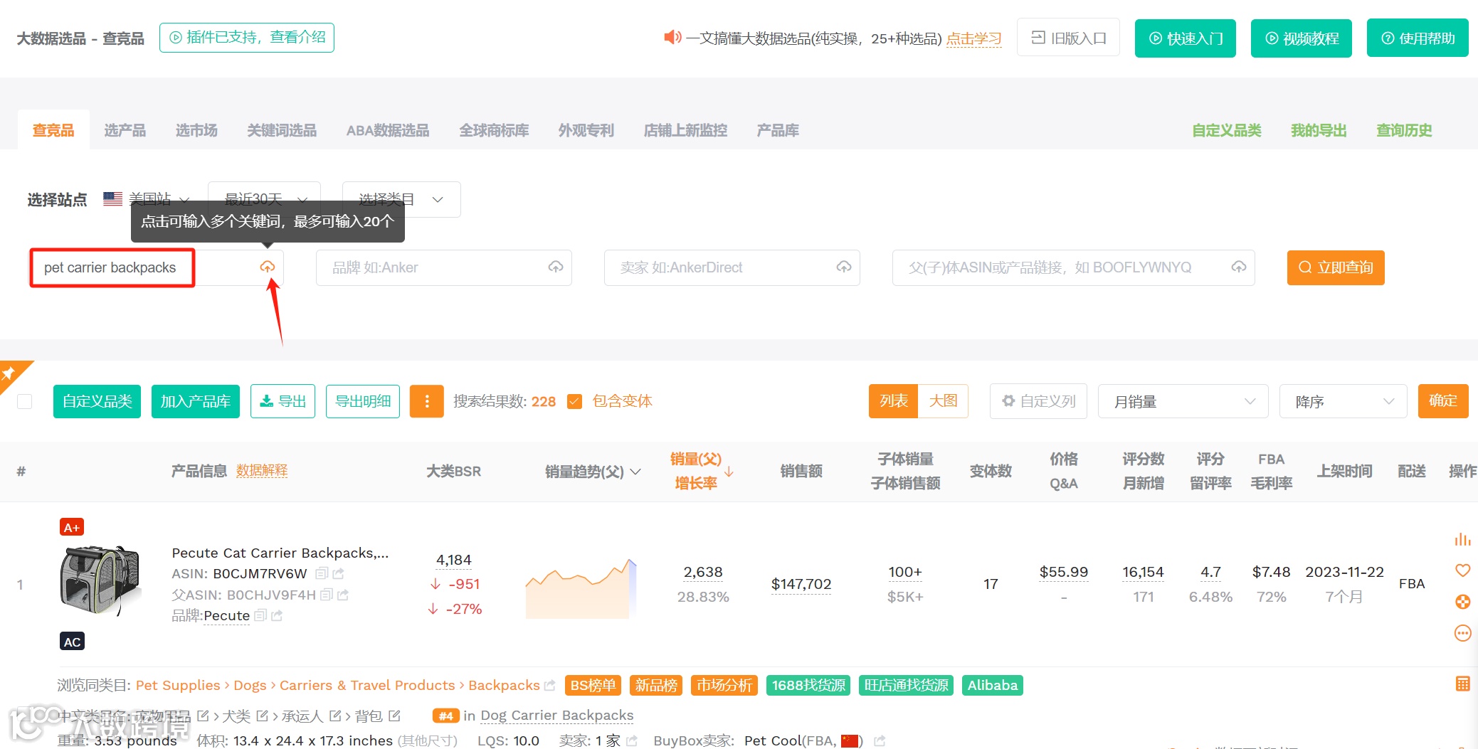3、在卖家精灵【查竞品】中输入关键词,验证亚马逊上是否存在成熟产品。