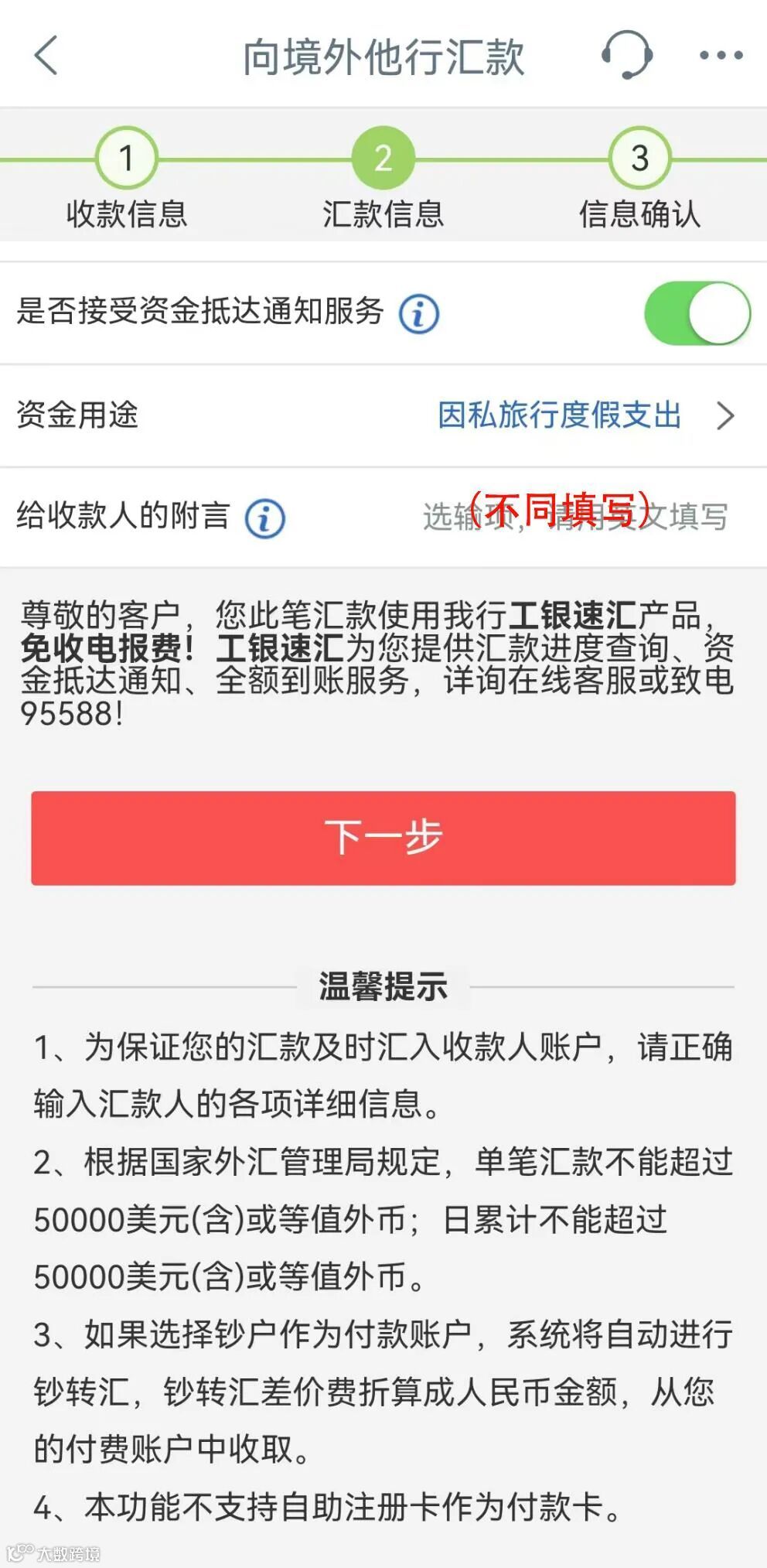 • 收款人姓名:工银亚洲账户的英文大写拼音(如ZHANG SAN)