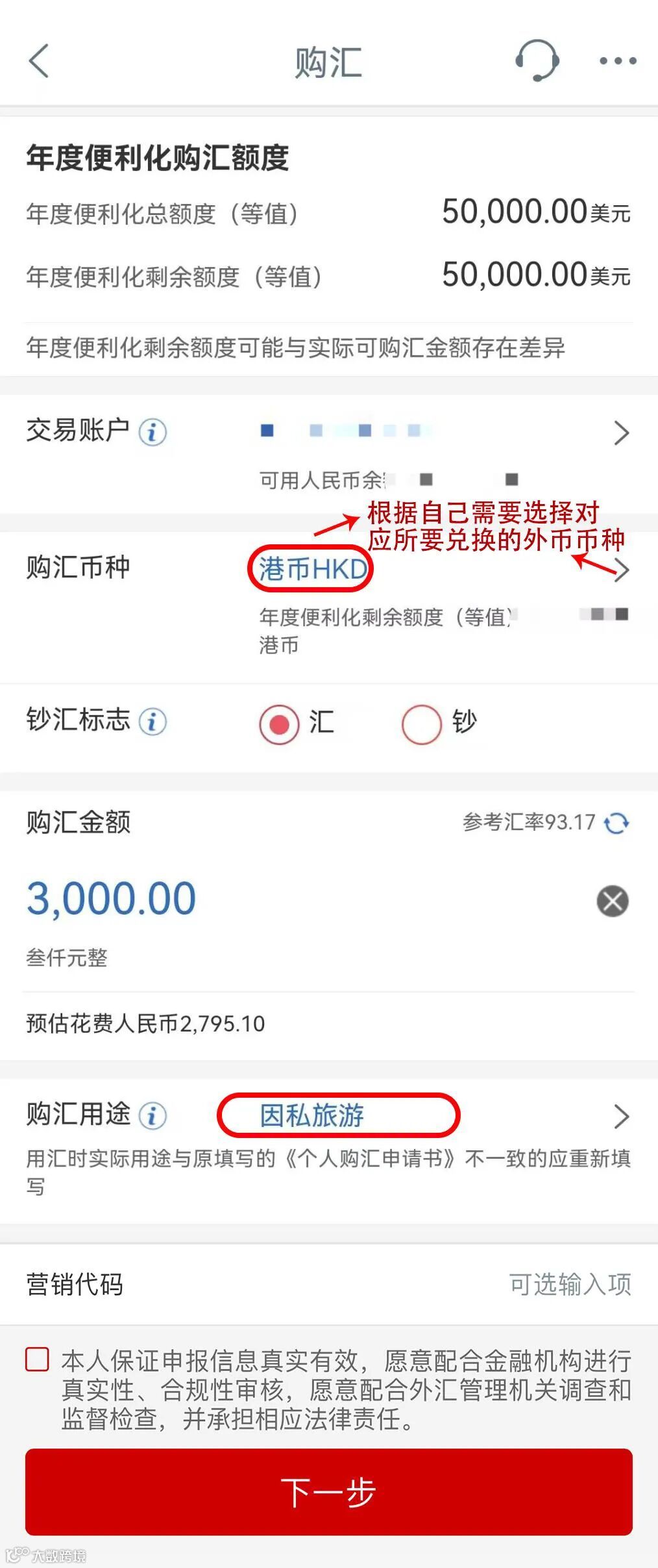• 币种选「港币」→ 勾选「无需取现」→ 用途选「因私旅游」(必填项,不可改)