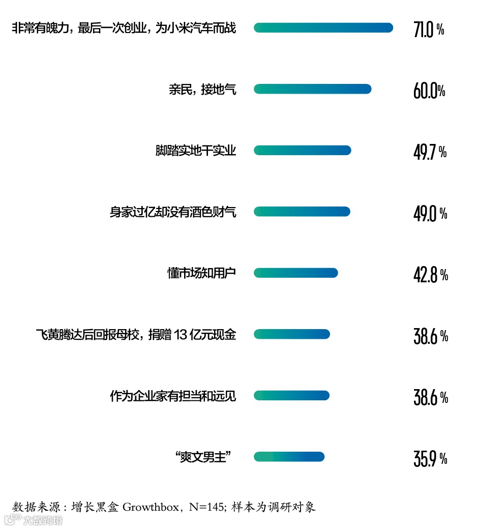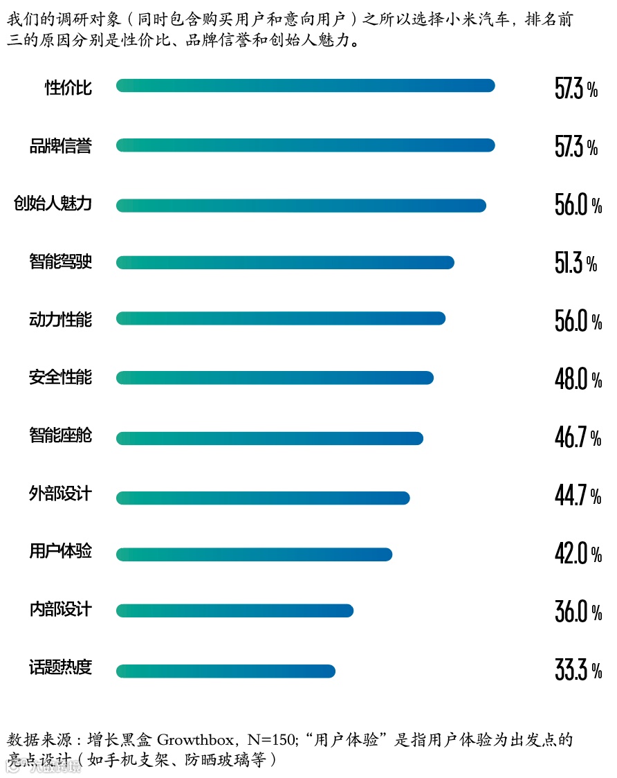 增长黑盒Growthbox 2024年5月调研显示,在50位已购SU7车主与100位准车主中,促成购买决策的前三因素为性价比、品牌信誉与创始人魅力。高达97%受访者认为雷军对小米有积极影响