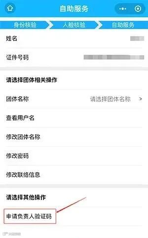 第一步:重复上面的操作,新的负责人通过“自助服务”小程序进行人脸识别申请“负责人验证码”;