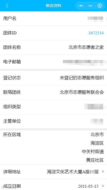 志愿团体登录后,点击“我的”点击“修改资料”,进入志愿团体资料页面,可修改志愿团体的资料。