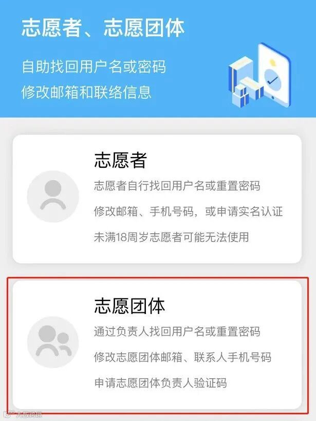 注:志愿团体登录账号每30天需要短信验证一次,需要联系人的手机号码验证,请如实填写。