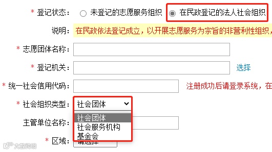 社会组织类型是社会团体、社会服务机构、基金会的组织,在注册志愿团体的时候,登记机关应该选择本组织所登记的民政部门,并且由该民政部门登录管理账号进行审批志愿团体。