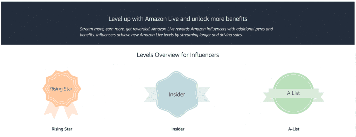 Amazon Live 具有三个级别,可帮助您取得成就并实现目标。当您在直播中进行更多直播并实现更多销售时,亚马逊将奖励您额外的福利,以推动更多流量和销售。一旦达到每个级别的最低要求,您将需要申请升级。