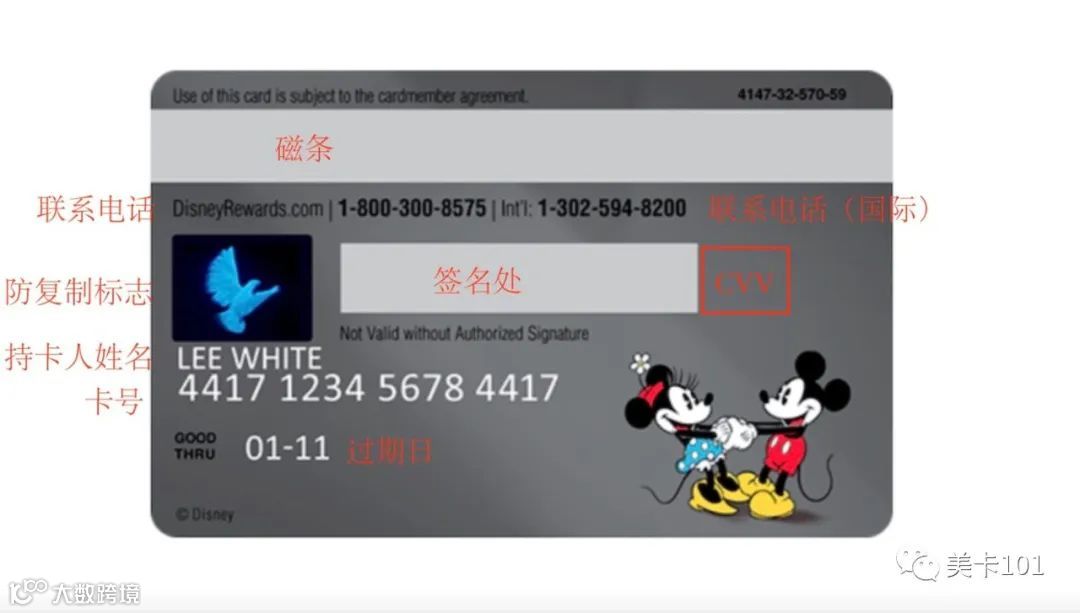 以 Chase Disney 联名卡为例,从左至右、从上至下解析各项信息[k]。