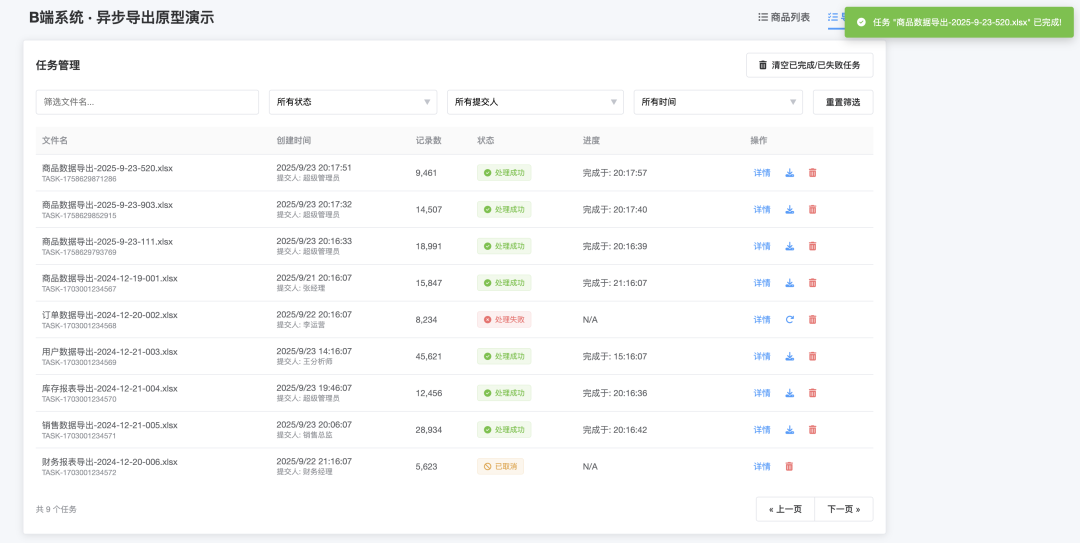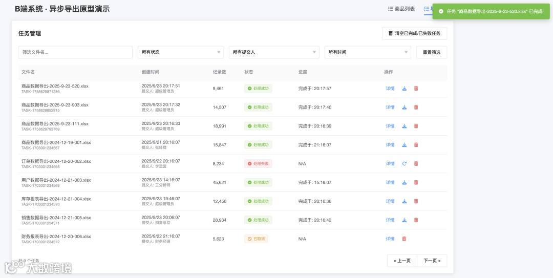 前端系统迅速捕获此请求,弹出一个简洁的提示框:“您的导出任务已提交成功,任务ID:[EX123456],请前往导出任务中心查看。”此时,用户界面已完全恢复可操作状态。 -