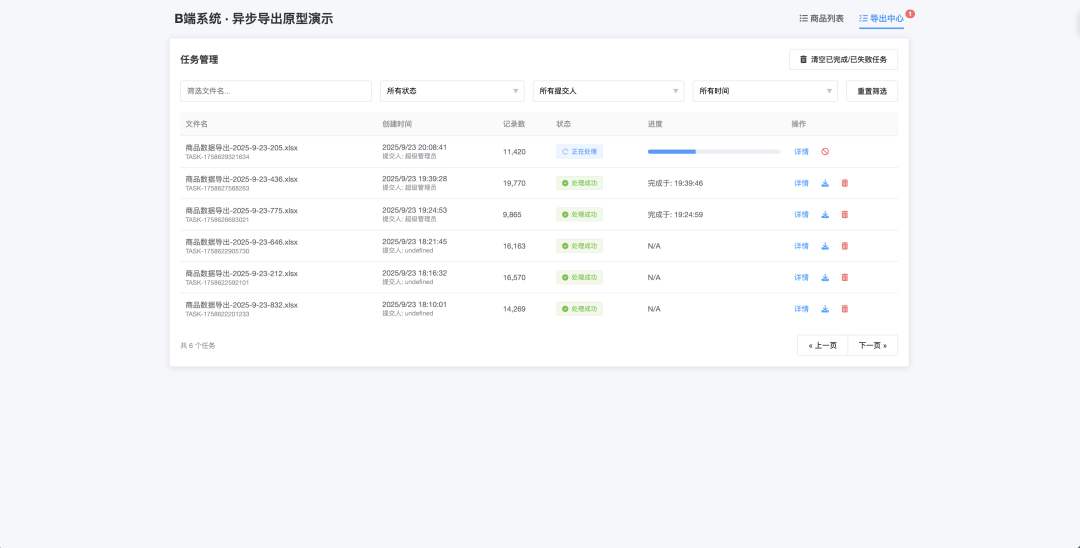 我使用Cursor生成了一个可交互的“B端系统 · 异步导出原型演示”,上面的几站图都是我从这个原型中截取出来的,大家可以点击这个地址直接在线访问。