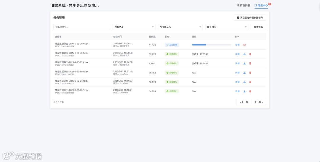 用户可以随时访问系统的“导出任务中心”。在这里,他们能看到所有历史导出任务的列表,包括任务名称、提交时间、当前状态、完成时间、文件大小等。 -