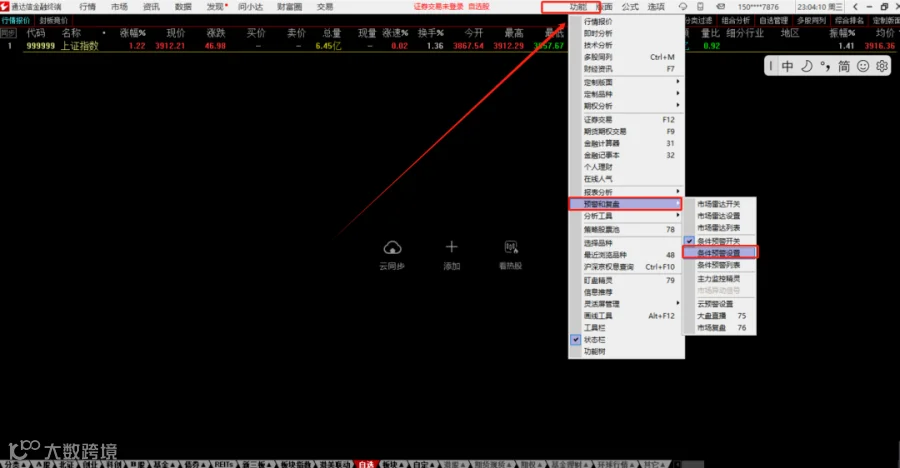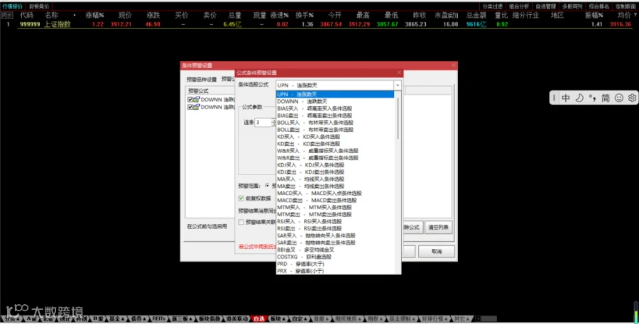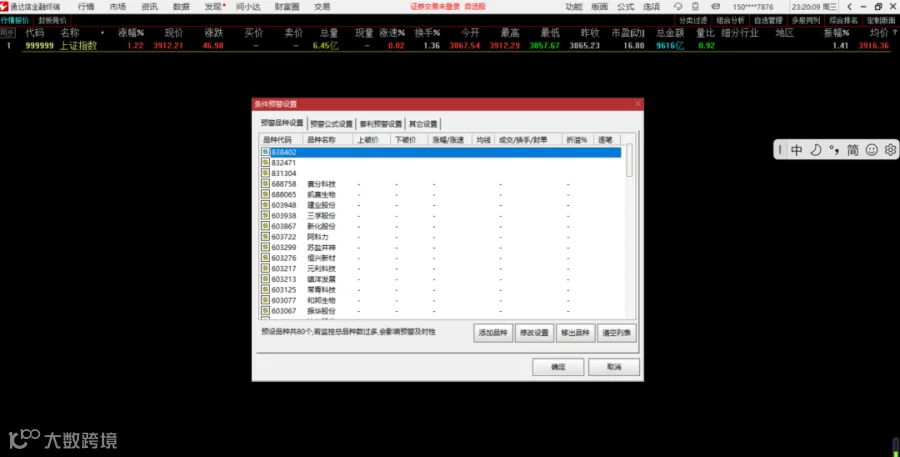 进入 "功能→预警系统→条件预警设置",在通达信中利用其公式编写功能,依据自己的交易策略编写选股公式,例如基于均线金叉、MACD 指标形态、成交量变化等条件来筛选股票。