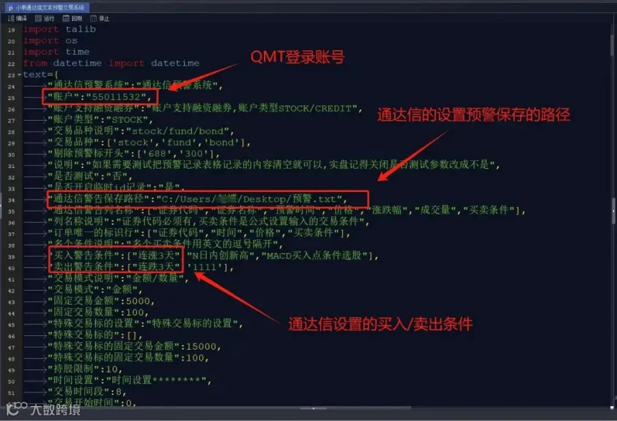 在导入的策略中,配置相关参数,比如修改账户与登陆的QMT账户一致,设定每只股票的下单数量、总仓位控制规则、止损止盈条件等。还需设置 QMT 读取通达信预警文件的路径,确保与通达信中设置的预警文件输出路径一致。