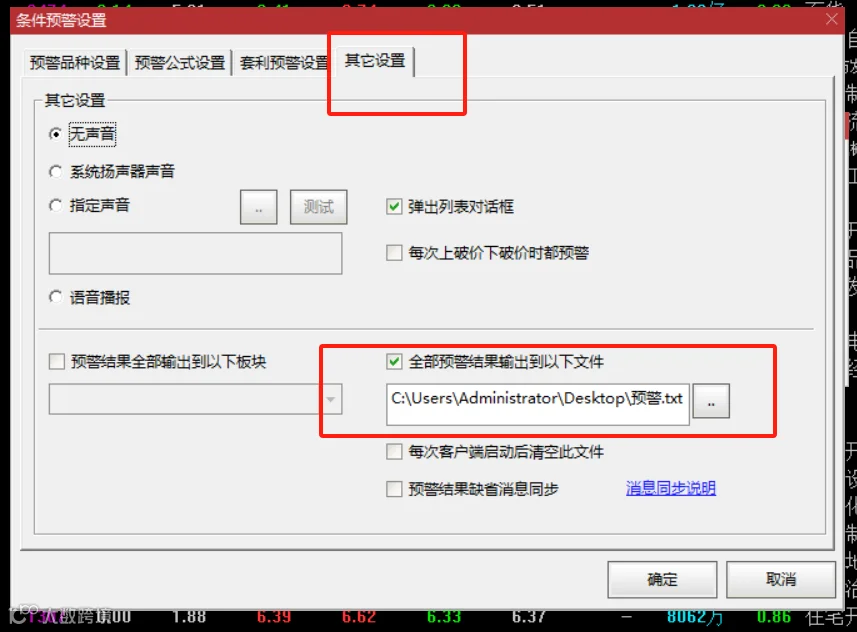同时勾选 "预警结果输出到文件",并指定一个固定的本地文件夹(如 "D:\TDX_Quant")用于存放预警结果文件,文件格式一般可选 TXT。
