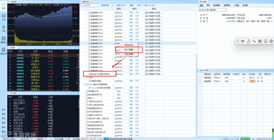 登录 QMT 量化交易系统,在QMT首页右击鼠标,点击 "导入策略",选择已准备好的能读取通达信预警文件并进行下单处理的策略文件。 (QMT 专属格式如 rzrk 文件)