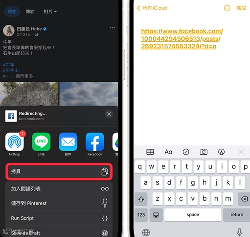 然后点选「拷贝」后,该则 FB 贴文的链接(网址) 就会被复制起来,你可以贴上到任何地方。