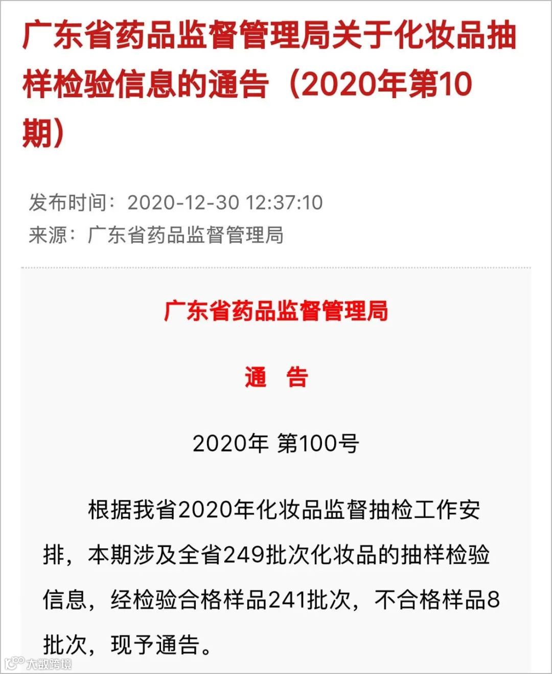 广东省药品监督管理局于2020年12月30日发布的《广东省药品监督管理局关于化妆品抽样检验信息的通告(2020年第10期)》显示:在抽样检验的249批次化妆品中,有8批次样品存在不合格情况。