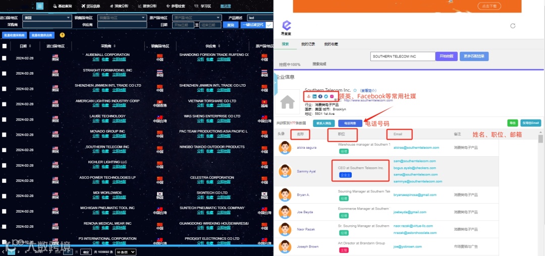 比如我们用这个海关数据就是自带有联系方式挖掘的,只要搜索出来之后,点击立即挖掘就可以看到客户的职位、姓名、邮箱、社媒和电话,还是非常方便的。