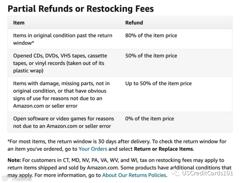部分商品不可退货,包括清仓商品(final sale)、食品、婴儿用品、礼品卡(gift cards)、下载类软件、已激活的订阅服务、缺失序列号或UPC的商品、活体昆虫等。Amazon明确列出以下不接受退货的商品类别:[k]