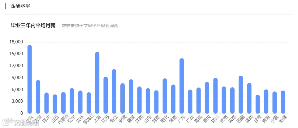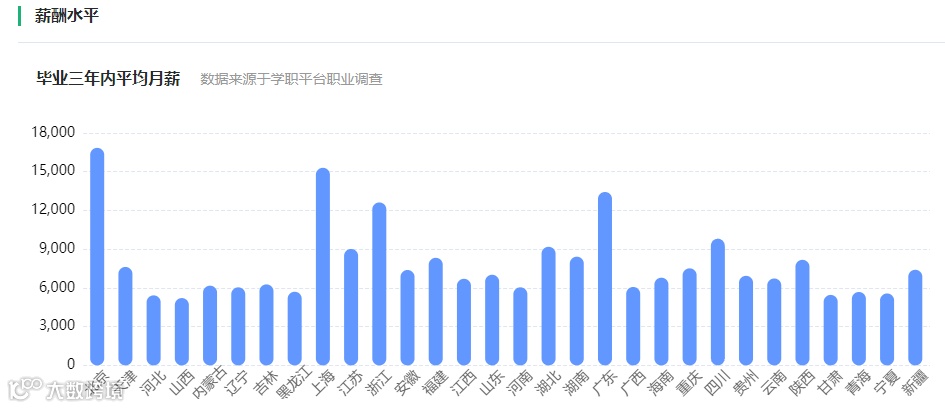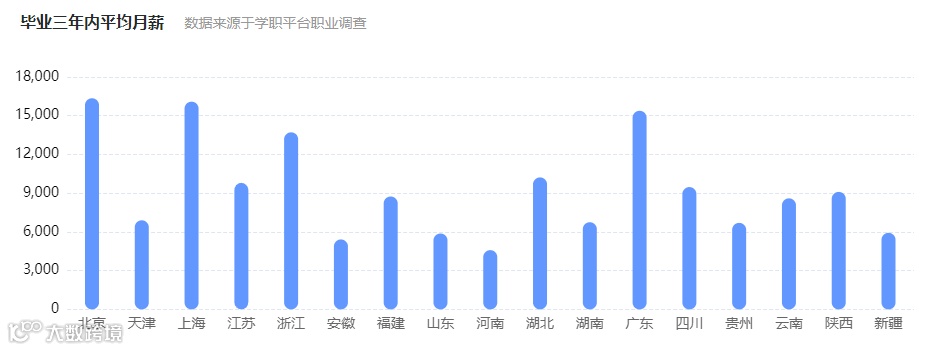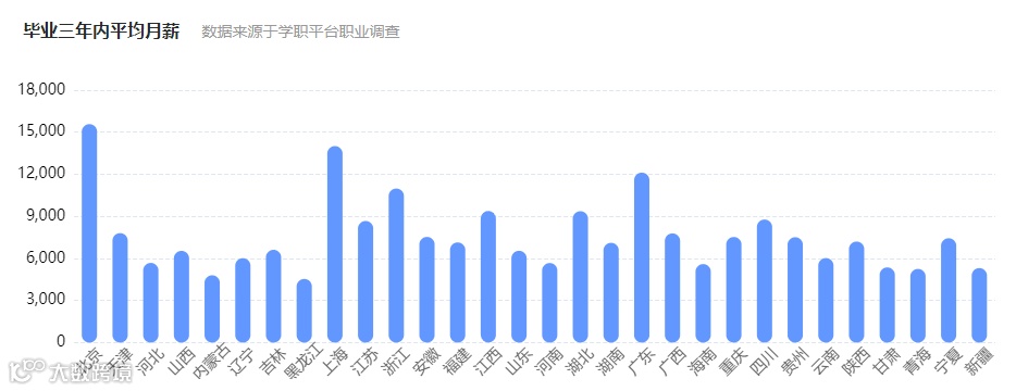 北京、上海、广东地区该专业毕业生三年内平均月薪超1.5万元;浙江地区超1.2万元;江苏、湖北、陕西、四川等地也均达9000元以上[k]。