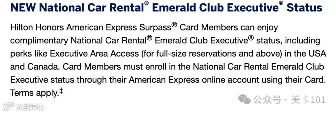 - 持卡人将免费获赠National Car Rental的Emerald Club Executive会员资格,提升租车体验[k]。